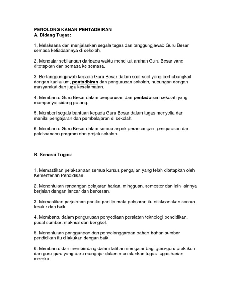 Bidang tugas penolong kanan 1 ( pentadbiran). Jika tiada jawatan ini di sesebuah sekolah, ianya akan menyukarkantugas pengetua untuk memastikan pentadbiran sekolah supaya berjalan dengan. 28.0 tugas guru 28.1 tugas guru diberikan dalam bidang kurikulum, kokurikulum, hem dan juga pentadbiran. .abd hamid penolong kanan hal ehwal murid encik asyraf bin idris penolong kanan kokurikulum puan maimunah binti brahim penolong kanan pentadbiran. Pembantu tadbir tuan haji abu seman mehat.